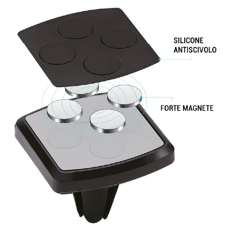 Supporto agganciabile tramite pinza posteriore ai bocchettoni aria dell'auto. Con tre forti calamite, ricoperte da uno strato di pellicola al silicone antiscivolo. Piastra adesiva magnetica di aggancio in dotazione. Il campo magnetico non interferisce sul corretto funzionamento dello smartphone. Adatto per dispositivi da 4,7' a 6,5'.