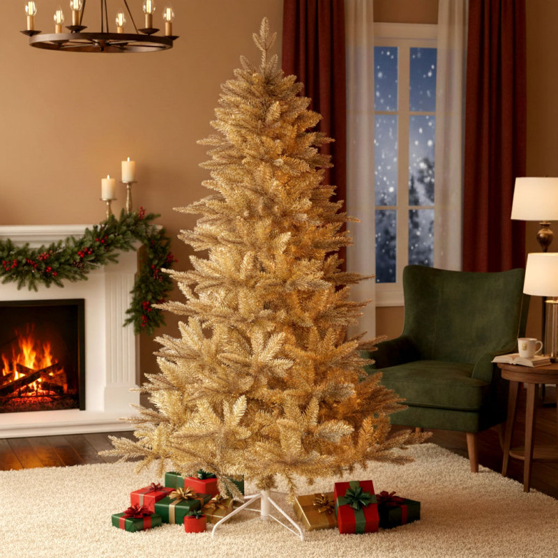 Albero con aghi in materiale pe stampato ad iniezione color oro e pvc oro, struttura e base in metallo, corone in metallo con apertura facilitata ad ombrello. da assemblare.
