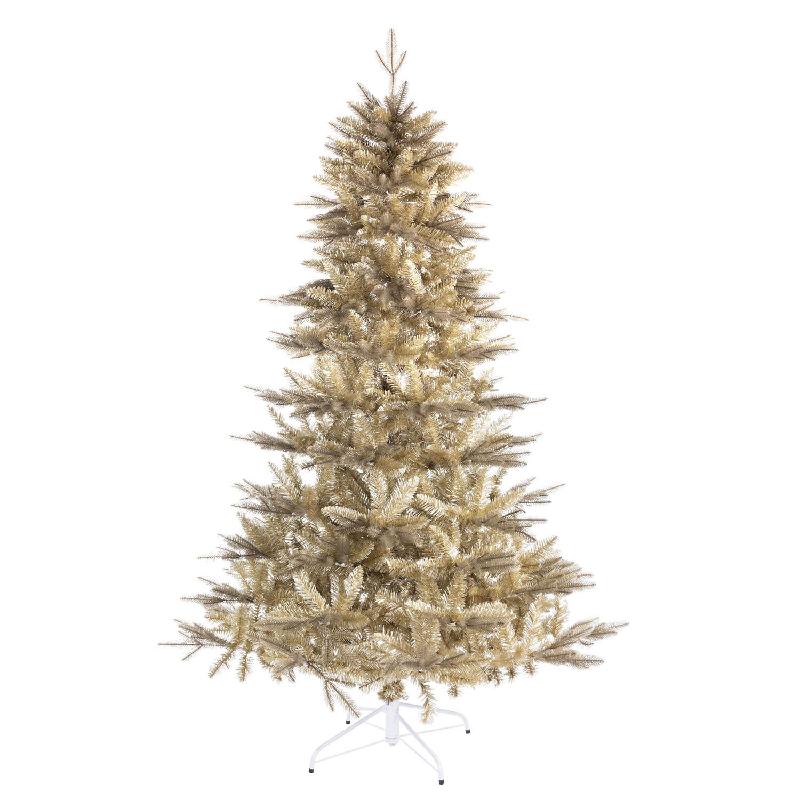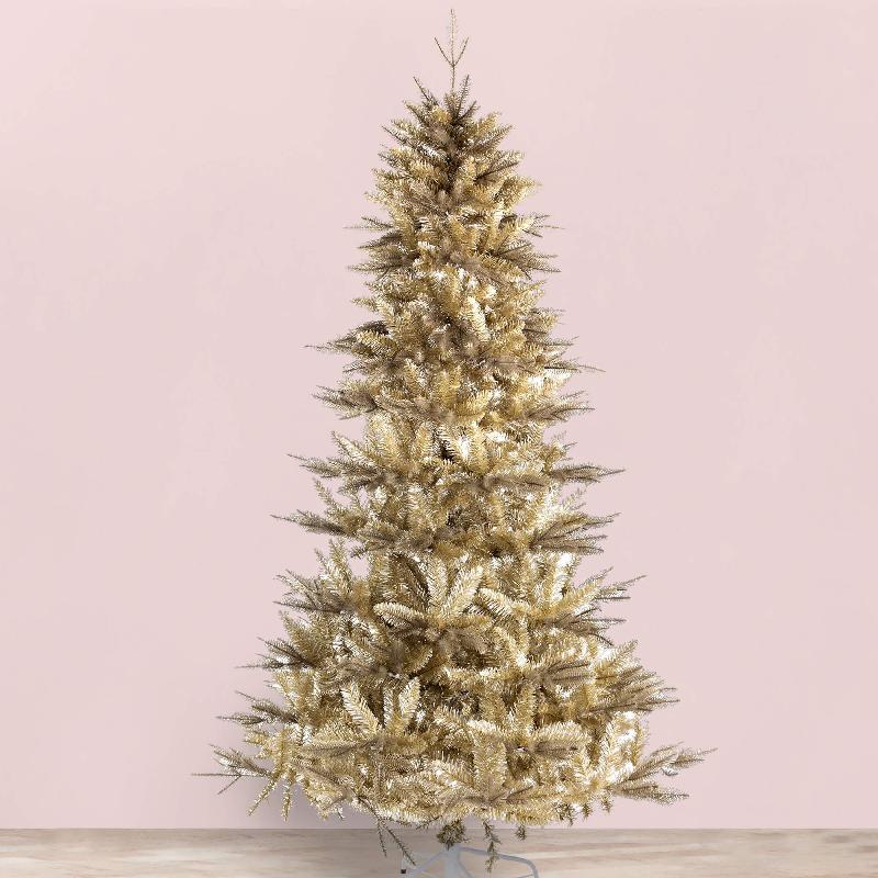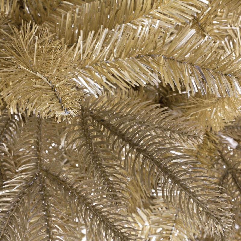 Albero con aghi in materiale pe stampato ad iniezione color oro e pvc oro, struttura e base in metallo, corone in metallo con apertura facilitata ad ombrello. da assemblare.