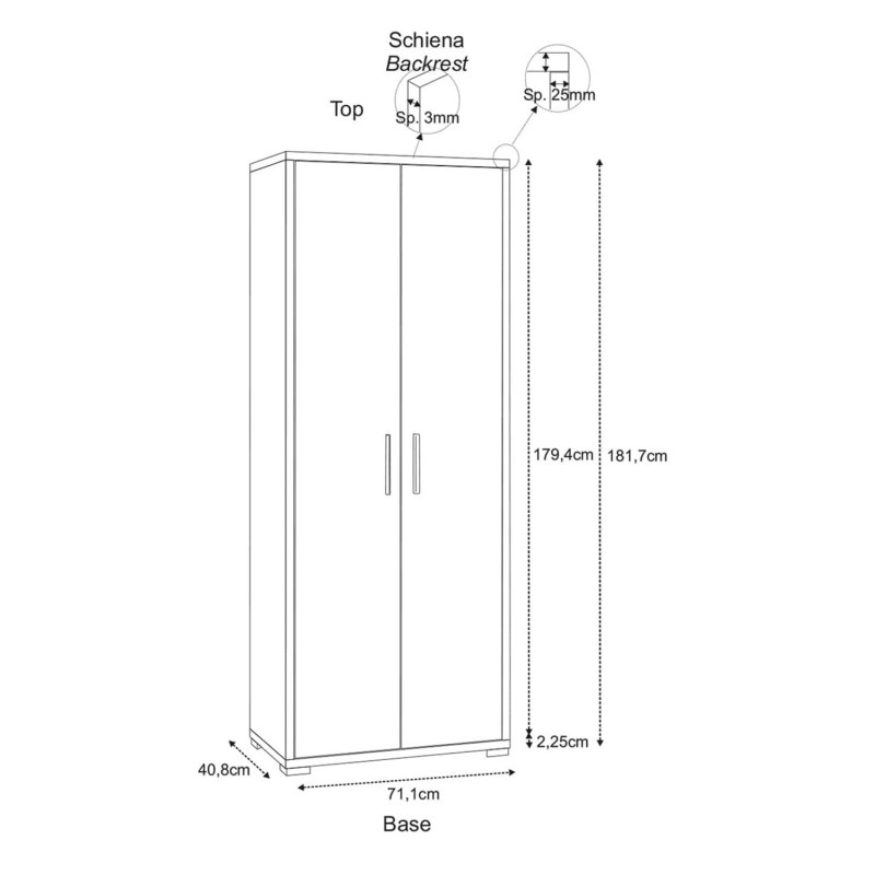 Struttura sp. 25mm e ripiani sp. 18mm, ante sp.16mm, bordi in ABS. Interno: 2 ripiani regolabili e 2 fissi. Maniglie e piedini verniciati cromo satinato. Mobile in kit.