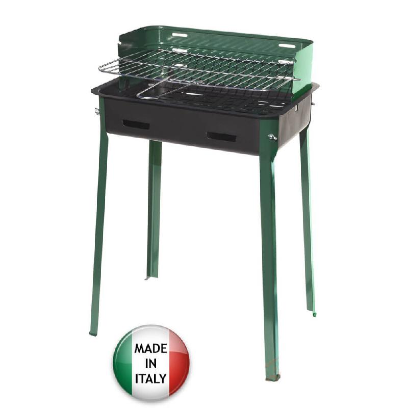 Barbecue a legna o carbonella con griglia in acciaio cromato regolabile in tre posizioni.