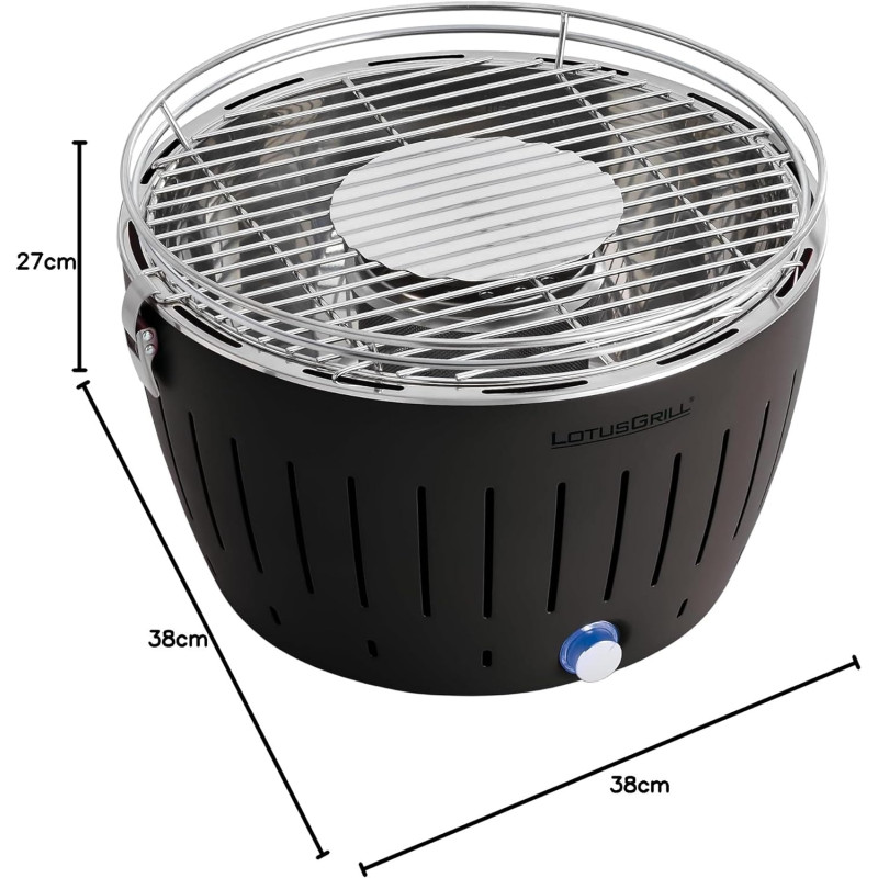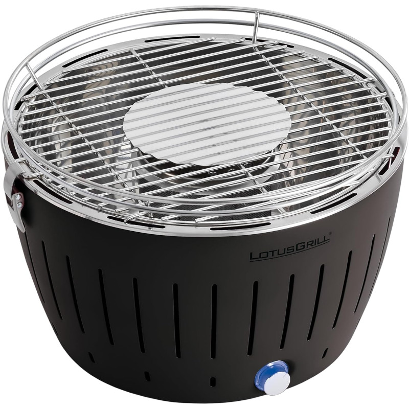 Il LotusGrill è un barbecue portatile dotato di una ventola alimentata a batteria, che soffia costantemente aria attraverso il carbone per accelerare il processo di accensione. Ciò consente al LotusGrill di essere pronto per l'uso in soli tre-quattro minuti. L'interruttore on/off non solo controlla la ventola, ma funge anche da regolatore di calore. Più aria viene soffiata, più la carbonella si riscalda.