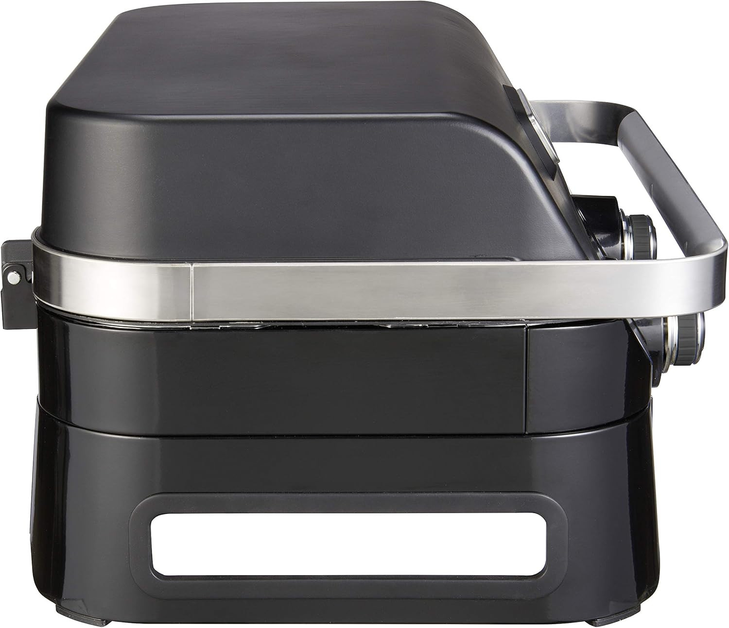 L'elegante coperchio in alluminio pressofuso nero opaco trattiene il calore e garantisce un'ottima cottura alla griglia.
