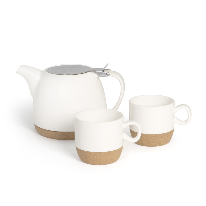 Set composto da una teiera con capacità di 0,6 lt e 2 mug realizzate in porcellana bianca con base in sughero da 14 cl. Gli articoli sono confezionati in una bellissima gift-box, che li protegge e li rende perfetti anche come idea regalo.