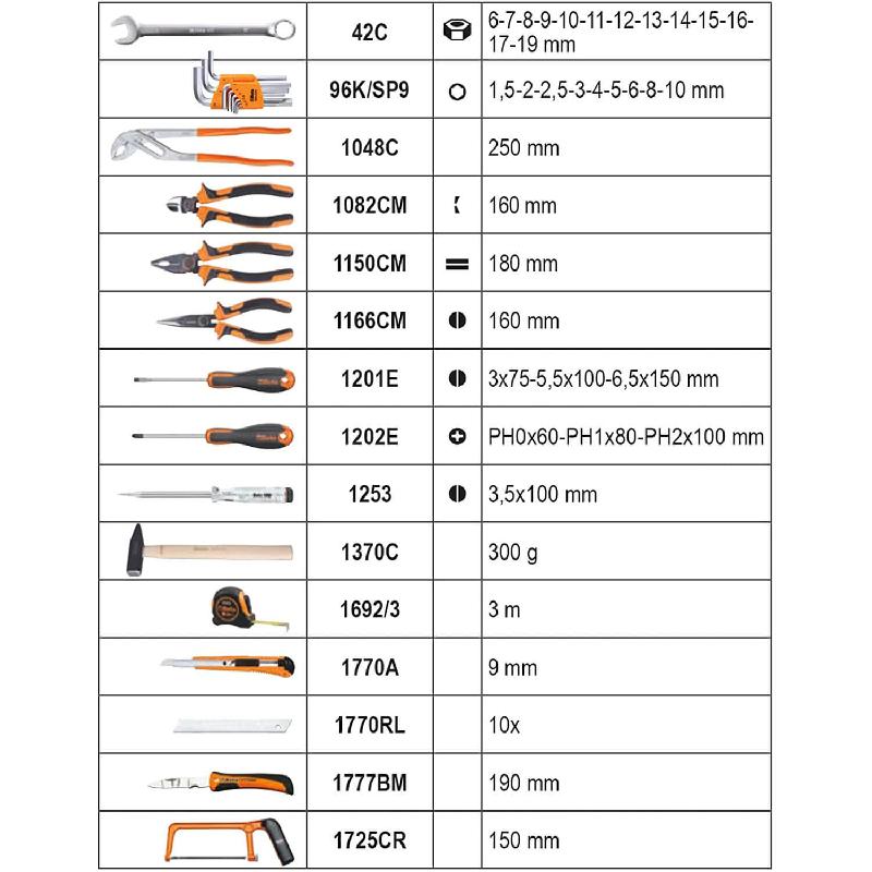 Nell'assortimento sono disponibili i seguenti attrezi: Chiavi combinate, Chiavi Maschio, Chiave Regolabile a Rullino, Pinze, Tronchese, Forbici per elettricisti, Giraviti, Microgiravite con inserti.
