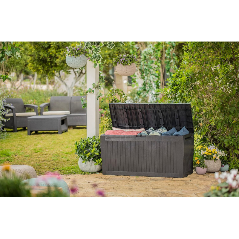 La sua generosa capacità di 270 litri offre ampio spazio di stoccaggio per cuscini, attrezzature da giardinaggio, giocattoli per esterni e molto altro ancora, mantenendoli al sicuro dagli elementi e facilmente accessibili quando ne hai bisogno.