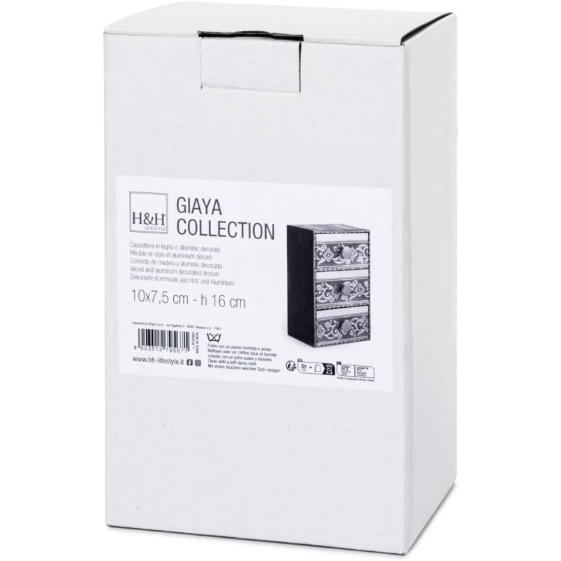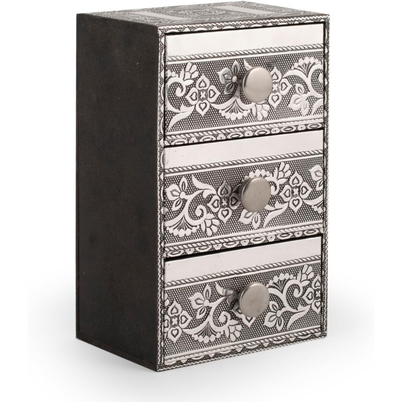 Cassettiera giaya in legno decorata in alluminio con preziosi decori orientali, con 3 cassetti cm 7,5x10. un dettaglio di arredo perfetto per chi apprezza l'arte e la tradizione orientale.