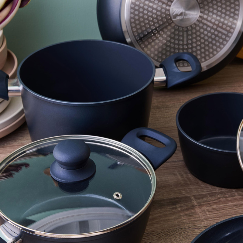 Batteria da 7 pezzi della linea Ocean, include padelle da 24 e 28 cm, casseruola con coperchio e pentola da 20 cm. Versatile e adatta a ogni esigenza culinaria.