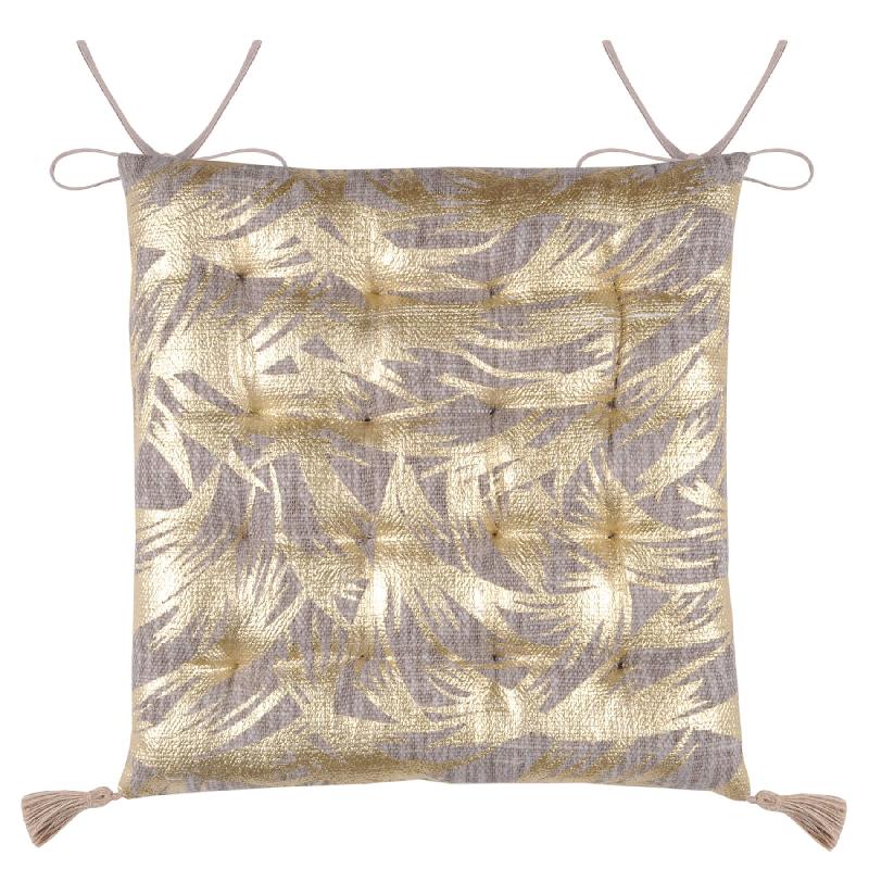 Cuscino da seduta per interno con fantastica decorazione di fogliame colore oro su fondo ecrù.