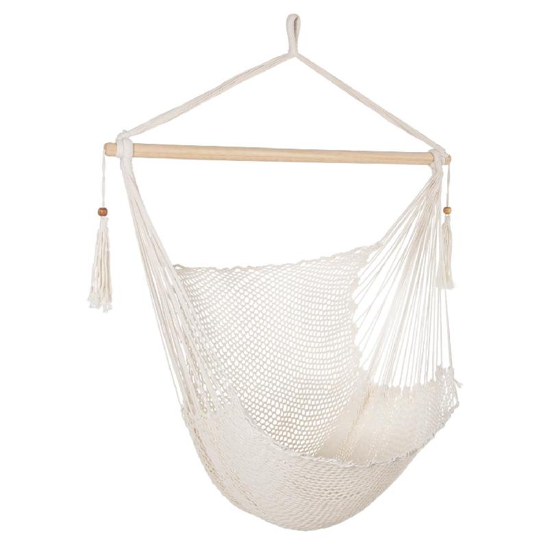 - Design elegante e resistente: L'amaca presenta una barra in legno massiccio con un diametro di 32 mm, che conferisce un aspetto rustico e naturale. La seduta è realizzata in tessuto poli-cotone (65% cotone, 35% poliestere), che offre comfort e resistenza.