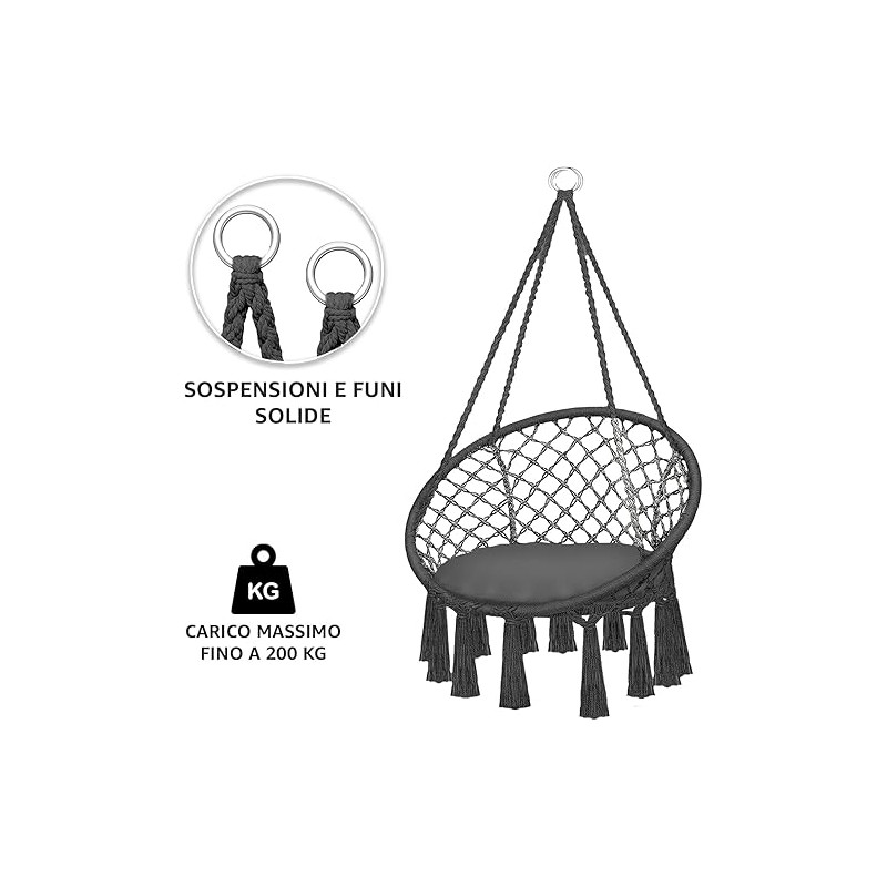 Questa elegante sedia sospesa combina comfort e resistenza, perfetta per rilassarsi in casa o in giardino. Realizzata con un robusto telaio in acciaio verniciato a polvere e un tessuto in cotone e poliestere, offre un design moderno e leggero con dettagli decorativi in macramè.