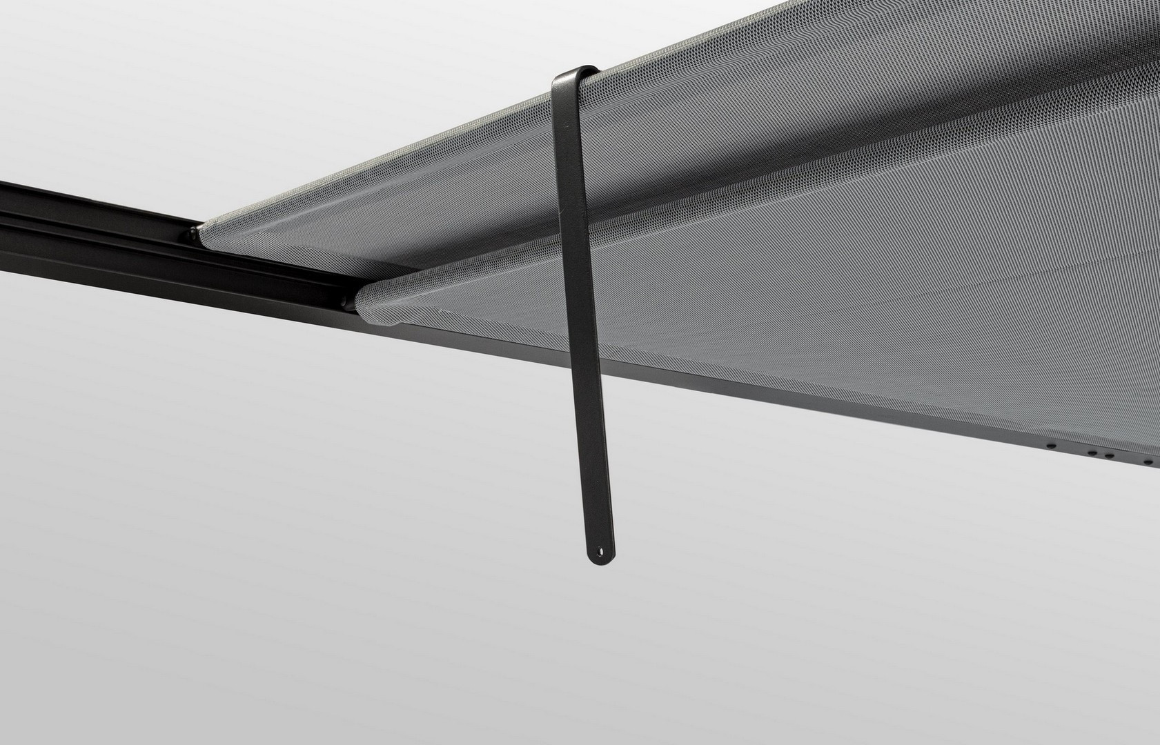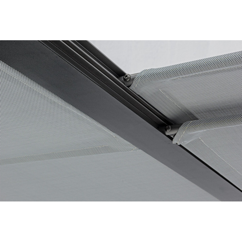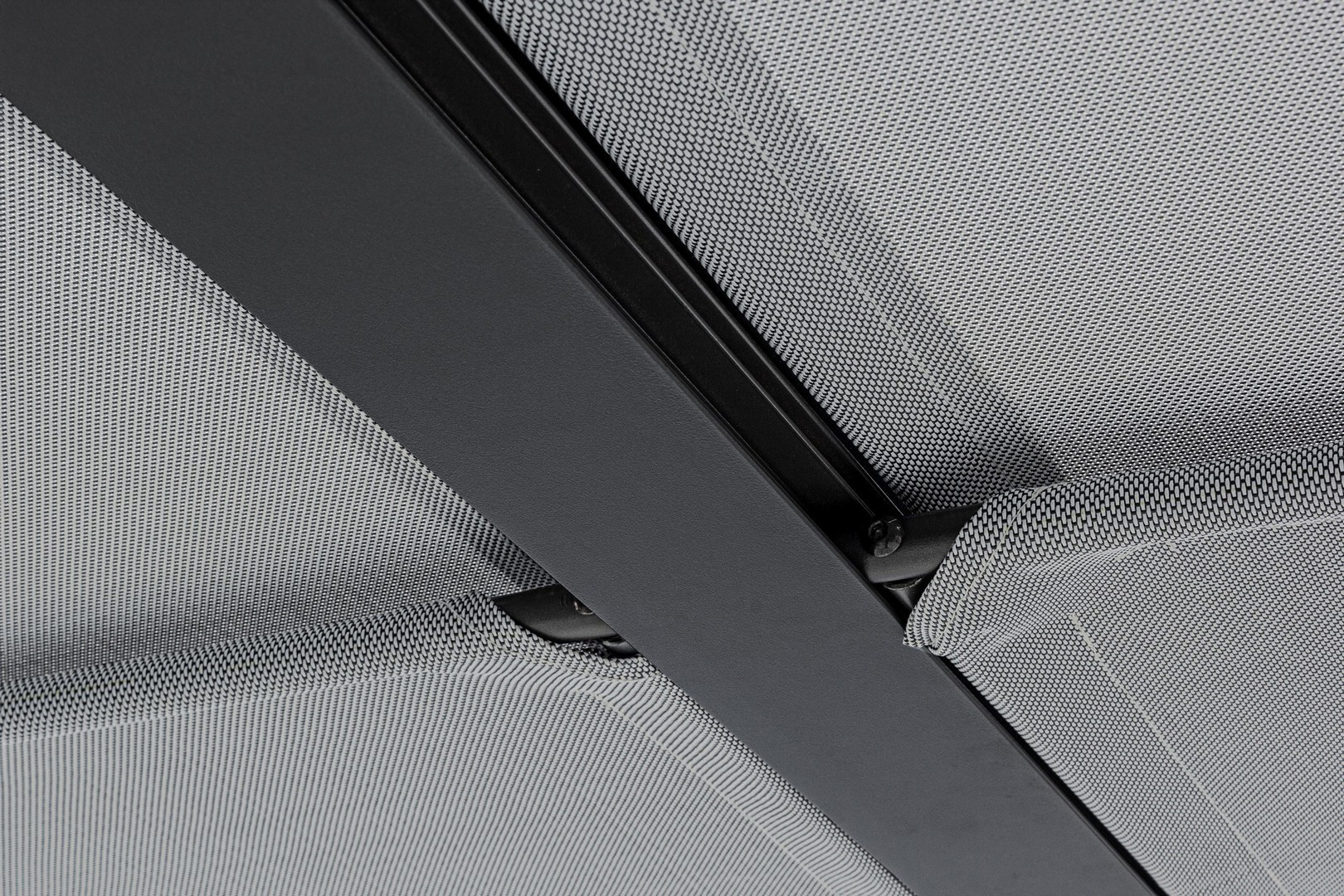 I pali misurano 65x65mm, tettuccio superiore scorrevole in textilene grigio scuro.