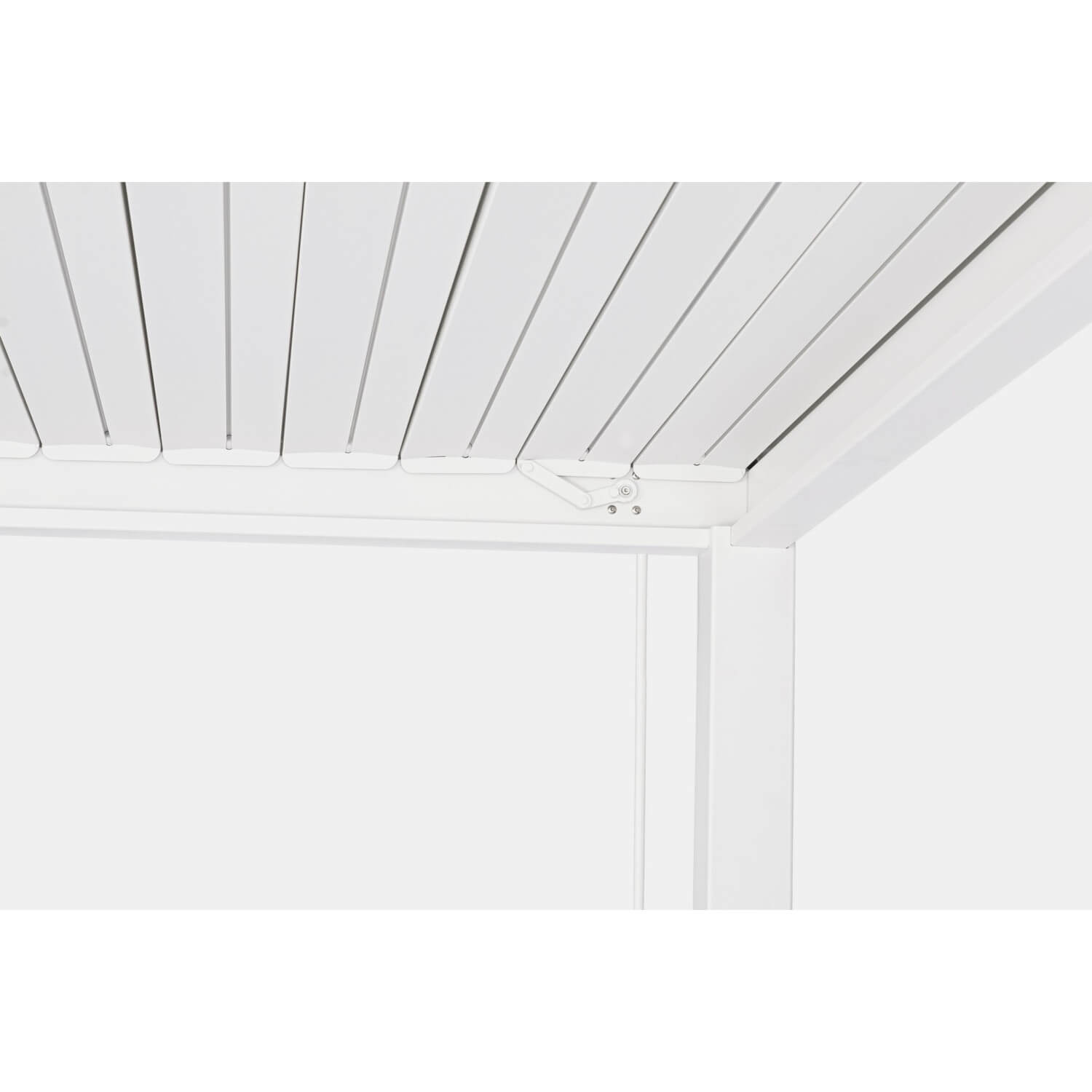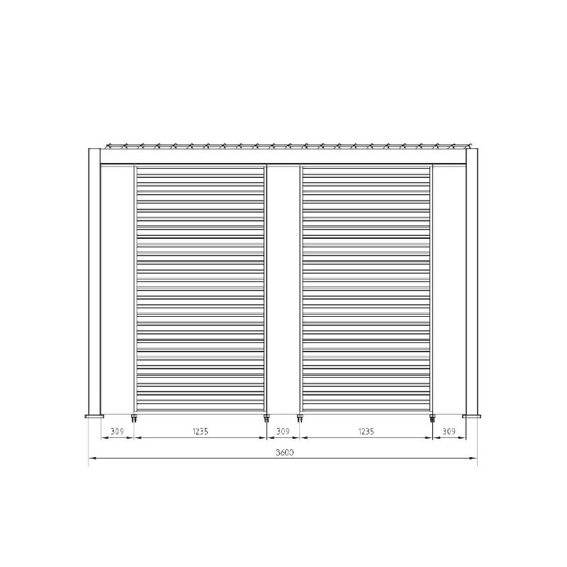 Il tetto lamellare della pergola è dotato di due manovelle, consentendo il movimento indipendente di ciascun settore delle lame frangisole a doppio strato di dimensioni 173x30 mm. Questo permette di regolare l'ombra e la ventilazione secondo le proprie preferenze, garantendo comfort in ogni condizione climatica.