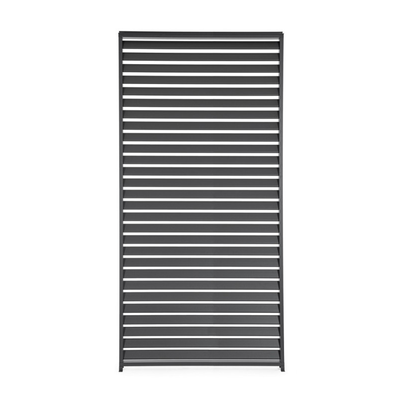 Alluminio verniciato a polvere (poliestere). pali portanti 60x25mm, lame frangisole fisse 65x15mm. sistema di fissaggio alla pergola con viti auto-foranti. l'articolo puo' essere usato in modo modulare per poter riempire un intero lato da 4m oppure a copertura di un solo angolo. viteria in acciaio inossidabile. da assemblare.