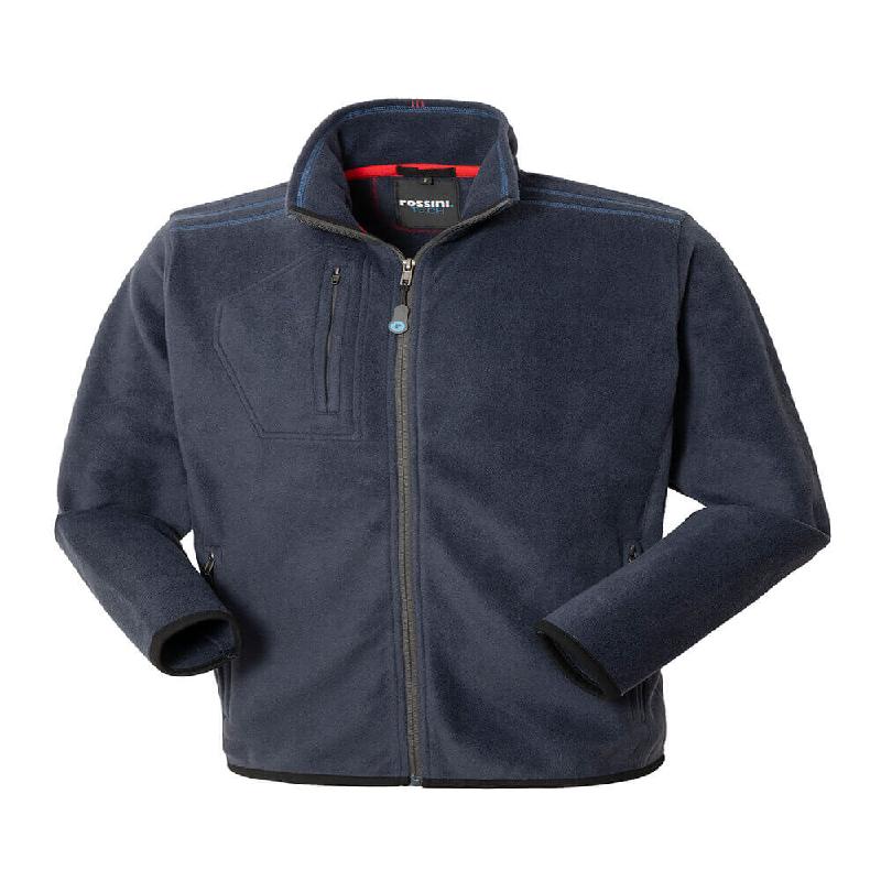 Collo alto con cerniera centrale aperta fino al fondo, 1 tasca al petto destro chiusa con cerniera, 2 tasche anteriori oblique chiuse con cerniera, travette di colore a contrasto.