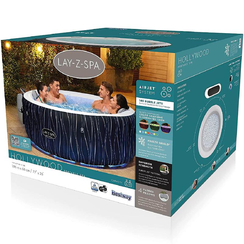 Dopo una lunga giornata, non c'è niente di meglio che immergersi nell'acqua calda e spumeggiante di un idromassaggio direttamente nel proprio giardino. La Lay-Z-Spa® Hollywood AirJet ospita fino a 6 persone, pur essendo facile e veloce da installare. Questo modello di spa è in grado di raggiungere fino a 40° C di temperatura, per offrirti, in combinazione con i suoi 140 AirJet, un'esperienza di massaggio unica nel suo genere. Basta collegare la pompa e rimanere a guardare mentre la vasca si gonfia da sola. Come se non bastasse, la spa Hollywood AirJet è anche dotata di luci LED che cambiano colore all'interno della vasca, per una atmosfera davvero magica, mentre il rivestimento esterno semi-trasparente crea un gradevole motivo illuminato all'esterno. Le luci plug-in possono essere controllate tramite telecomando per alternare tra 7 colori diversi.