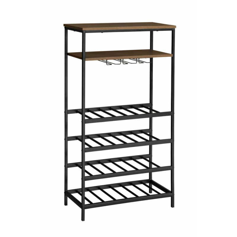Mobile per la conservazione delle bottiglie di vino, in metallo nero con top in MDF rifinito effetto legno scuro.