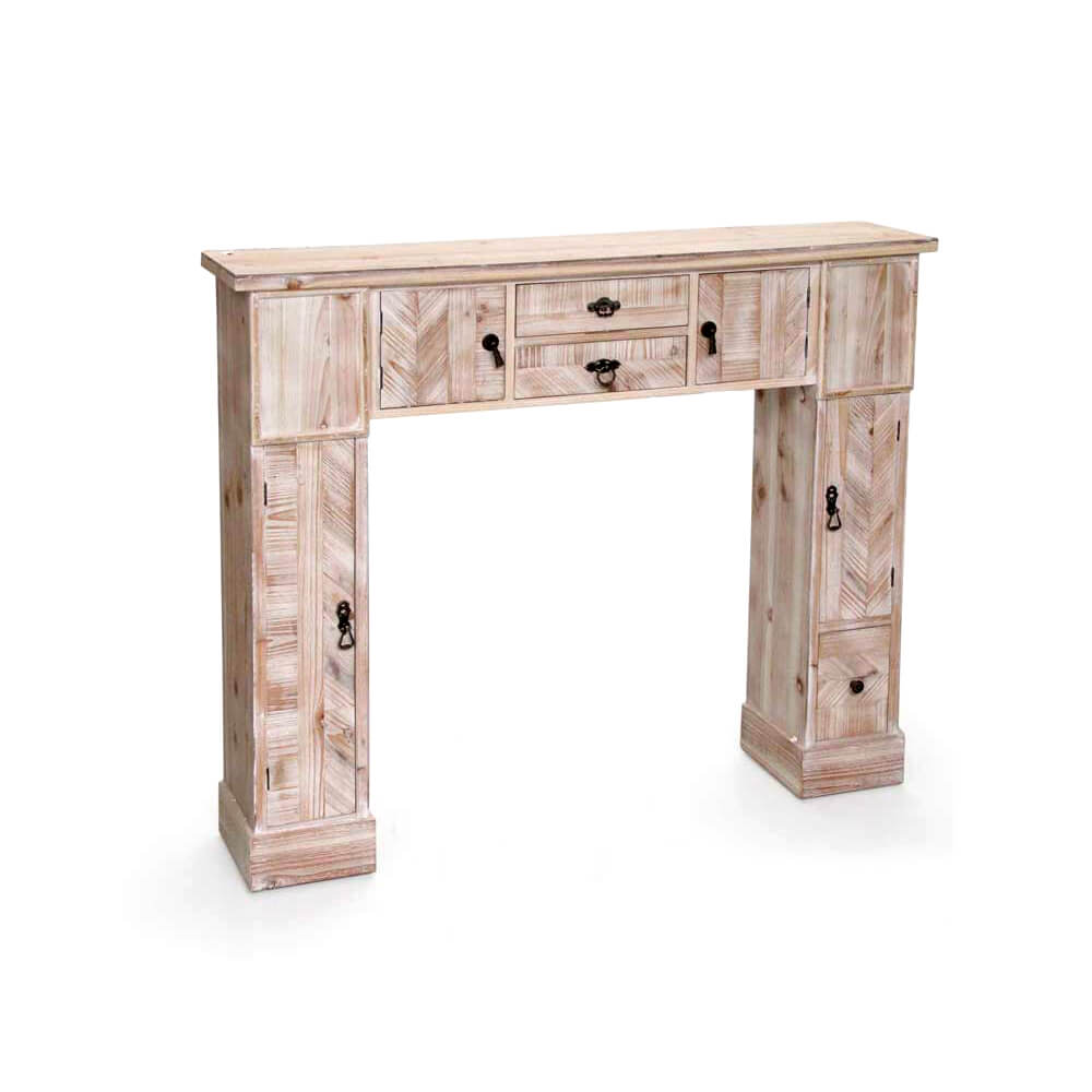 Cornice finto camino in legno, colore naturale chiaro effetto sbiancato.