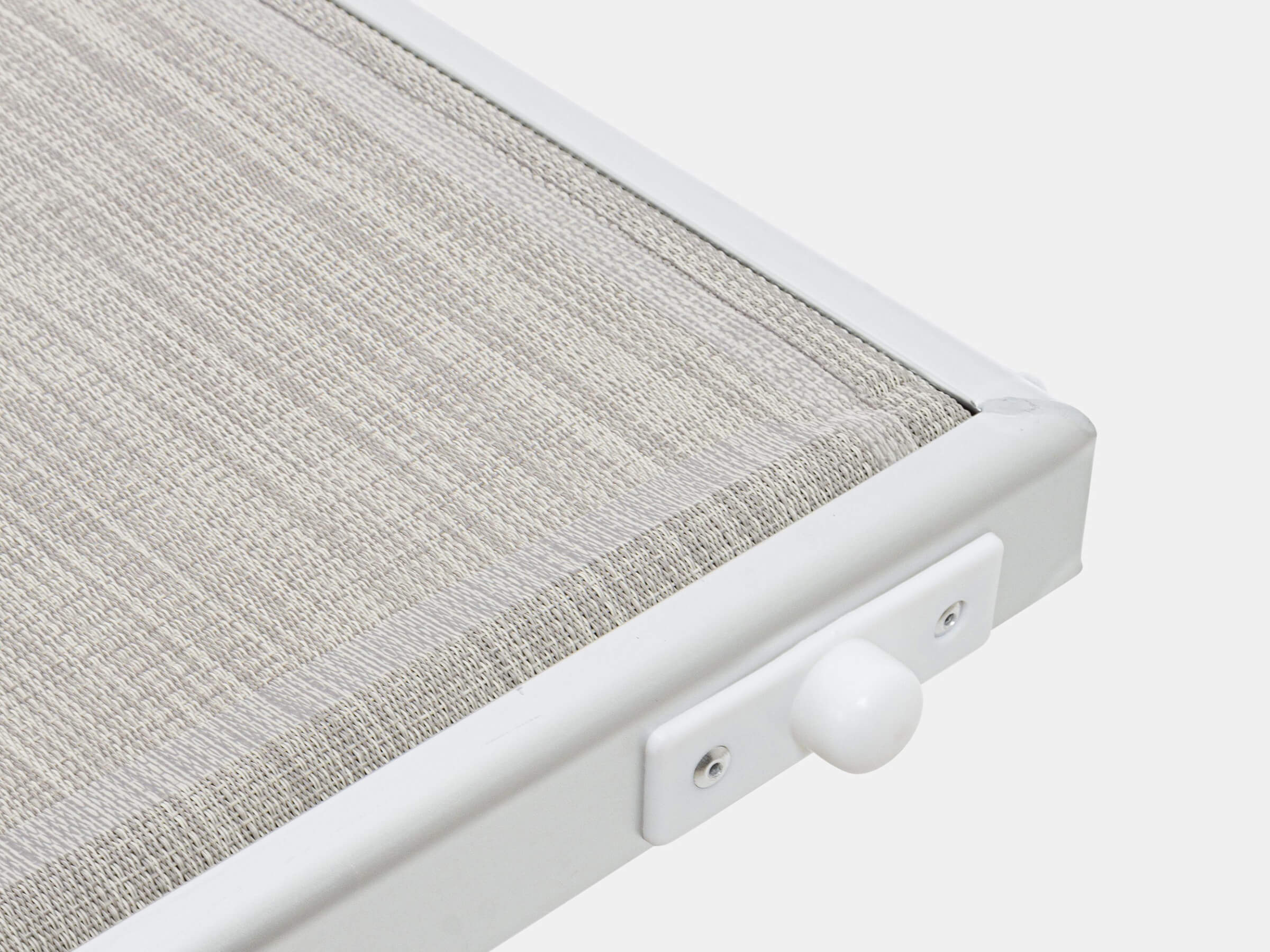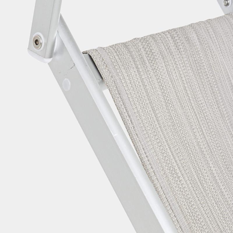 Il tessuto del lettino è realizzato in textilene 2x1 con una densità di 550gr/m2, noto per la sua resistenza agli agenti atmosferici e la sua facilità di manutenzione. Questo tessuto offre un comfort ottimale e una buona traspirabilità, garantendo una sensazione piacevole anche nelle giornate più calde.