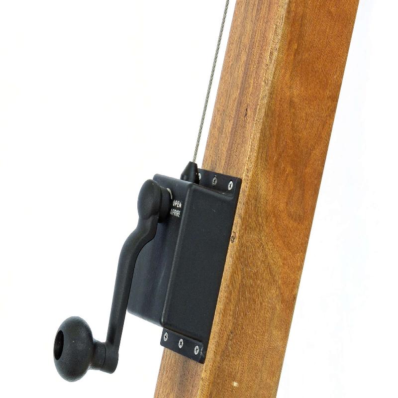 Il palo misura 93x93mm mentre le 8 stecche misurano 20x35mm con finali in alluminio e inserti in pelle e corona in legno.
