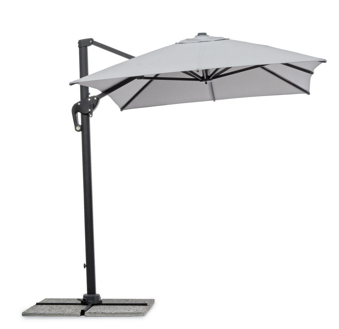 Ombrellone a braccio modello Ines realizzato con struttura in alluminio verniciata a polvere (poliestere) colore antracite e telo in poliestere 250 grammi al metro quadro di colore grigio chiaro con rivestimento in PA (poliammide).