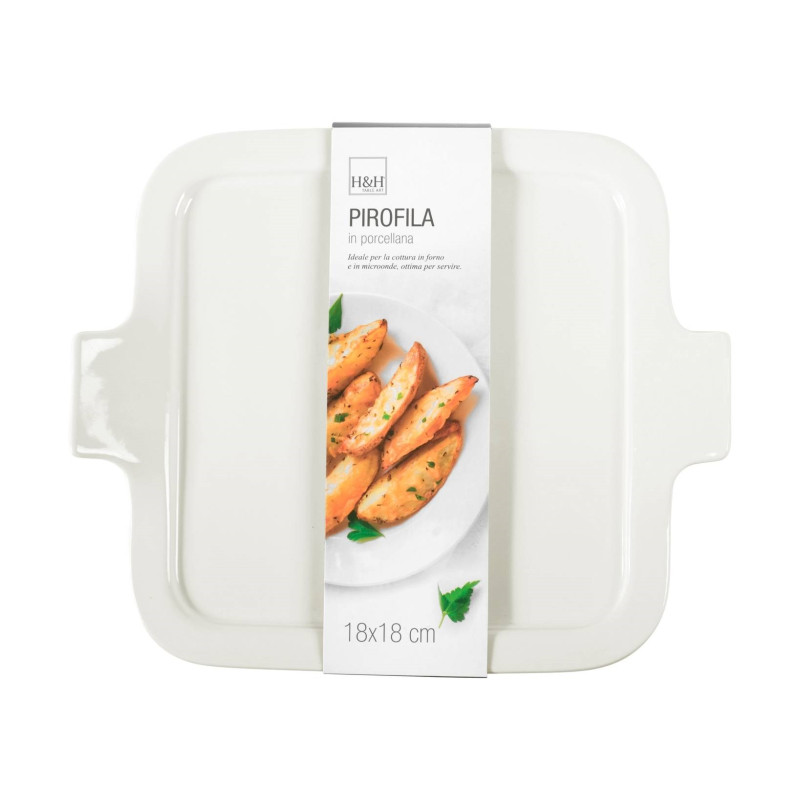 Pirofila quadrata con coperchio ,realizzata in porcellana , si distingue per il suo design svedese che la fa diventare un "vassoio" per servire in tavola le pietanze direttamente dal forno tradizionale o dal microonde.