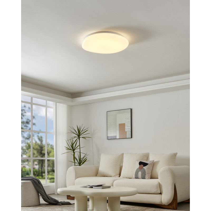 La plafoniera a LED SILERAS è composta da una base in metallo e da una copertura di forma organica in plastica bianca con diametro 60 cm. Quando la luce è accesa, crea un’illuminazione che ricorda un cielo stellato. Il telecomando in dotazione permette di smorzare le luci e modificarne la temperatura da bianco caldo a neutro a freddo e di impostare la funzione memory. Questa plafoniera è adatta ad arredi moderni e ad ogni ambiente, che sia la cucina, il soggiorno, la camera da letto , il corridoio o l'ufficio.