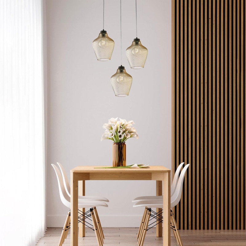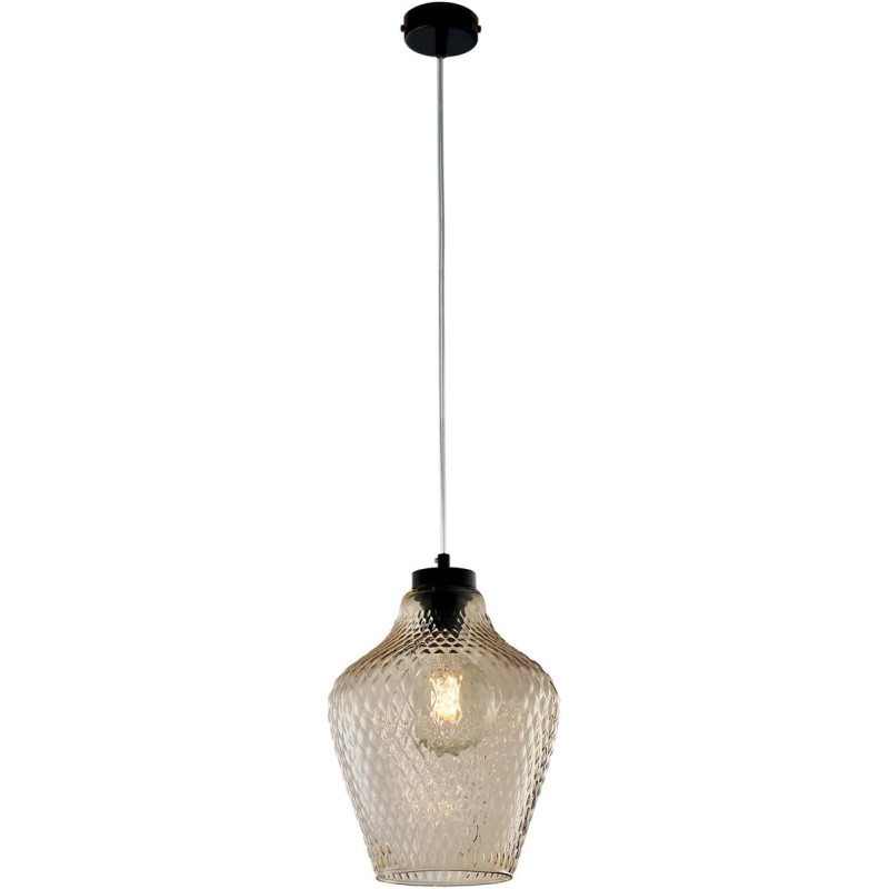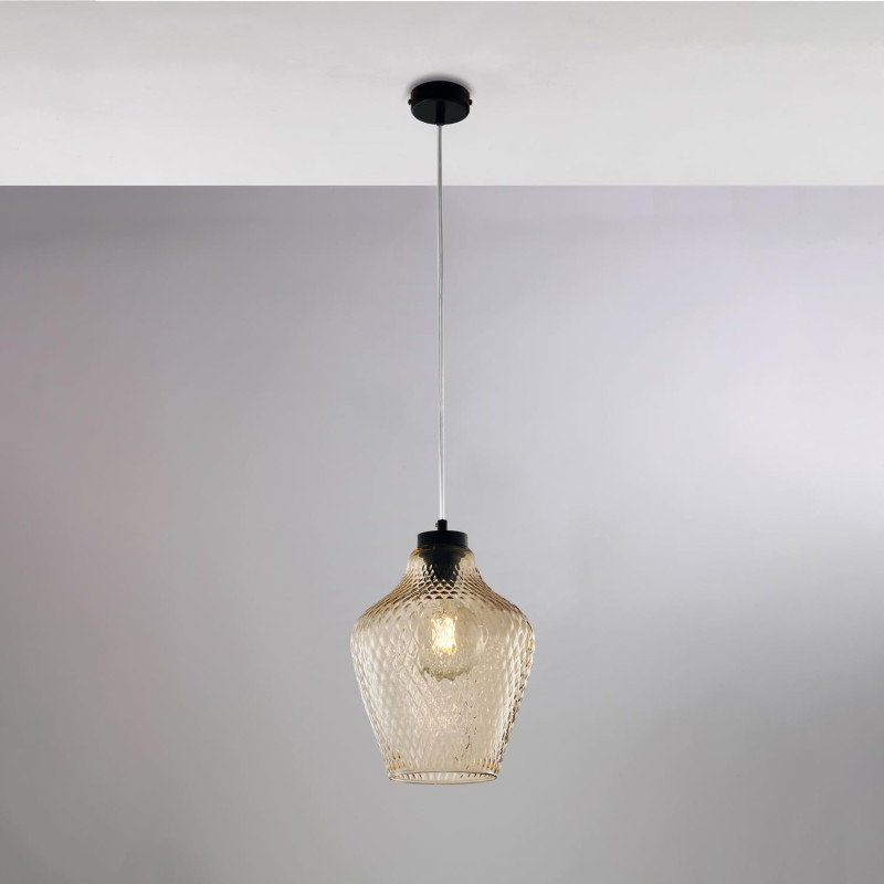 Sospensione in ferro laccato nero con cavo elettrico regolabile e diffusore in vetro soffiato ambra con decoro in rilievo 1 luce.
