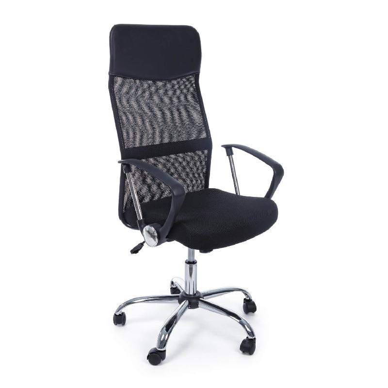 Base in acciaio cromato ø60cm. ruote in nylon. seduta imbottita e rivestita in tessuto 100% poliestere e tessuto a rete. braccioli in plastica (pp)e acciaio cromato. altezza regolabile. da assemblare.