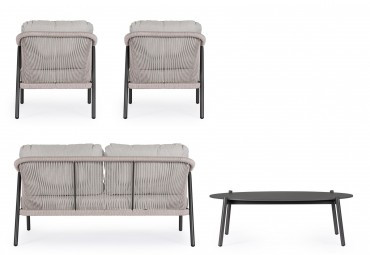 Il piano del tavolino è realizzato in pietra sinterizzata, una pietra naturale lavorata ad elevate temperature con uno spessore di 11 mm, che conferisce al set una robustezza e una bellezza senza pari. Questo materiale, oltre ad essere resistente agli agenti atmosferici, dona un'eleganza unica, perfetta per gli spazi outdoor.