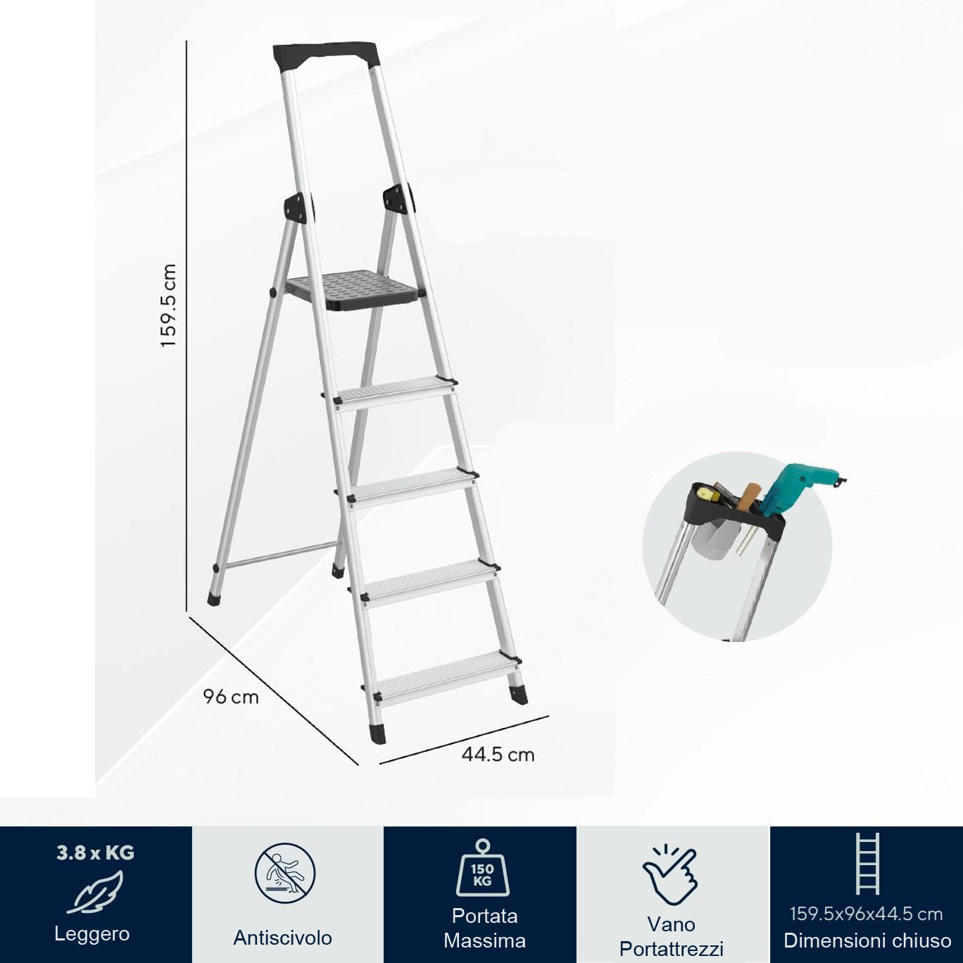 Quando hai bisogno di un aiuto pratico in casa, in garage o in giardino, la scala in alluminio a 5 gradini fa proprio al caso tuo. Si distingue per il suo design leggero, la facile conservazione e la facilità d'uso.
