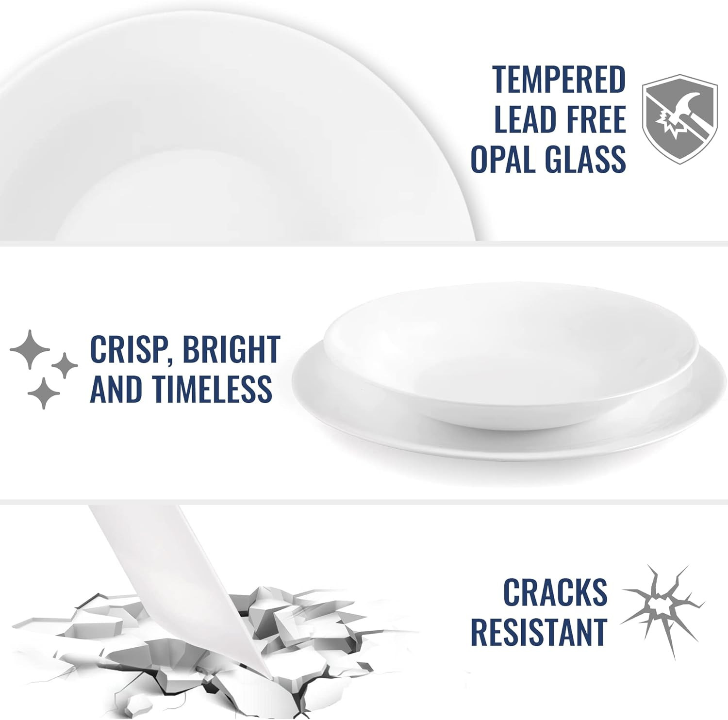 Il set contiene 6 piatti piani, 6 piatti fondi, 6 piatti dessert. Vetro opale: 100% vetro dalla caratteristica colorazione bianca, grazie all'impiego di fluoro.