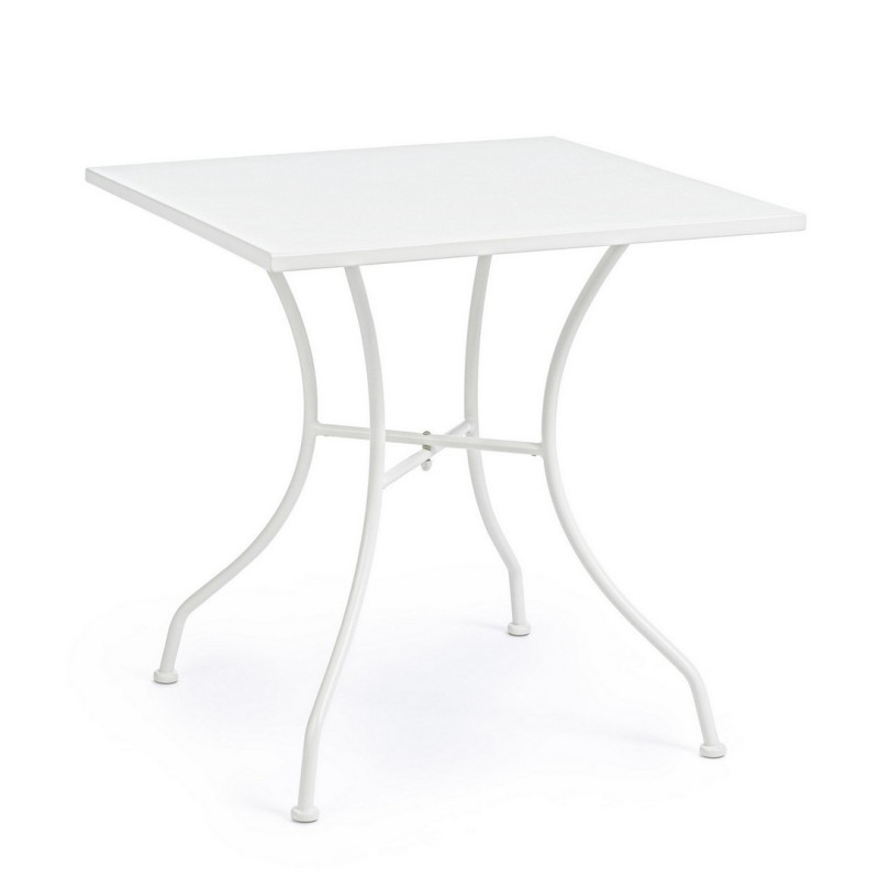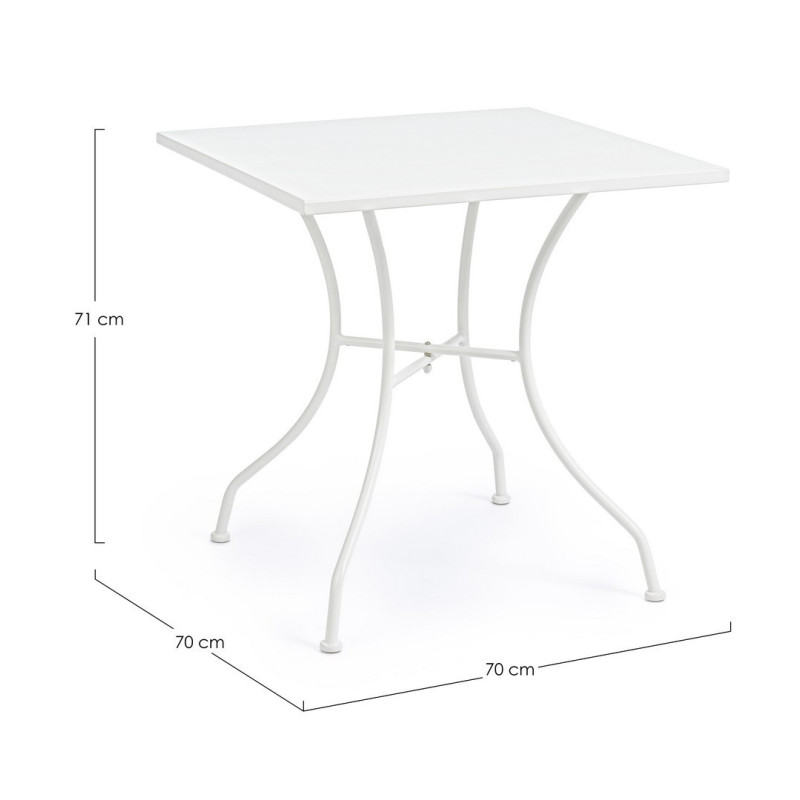Il tavolo, con dimensioni di 70x70 cm e un'altezza di 71 cm, è realizzato in resistente acciaio trattato per esterno e verniciato a polvere con finitura opaca. Le gambe da assemblare garantiscono stabilità su qualsiasi superficie, mentre la sua dimensione compatta lo rende ideale per spazi limitati.
