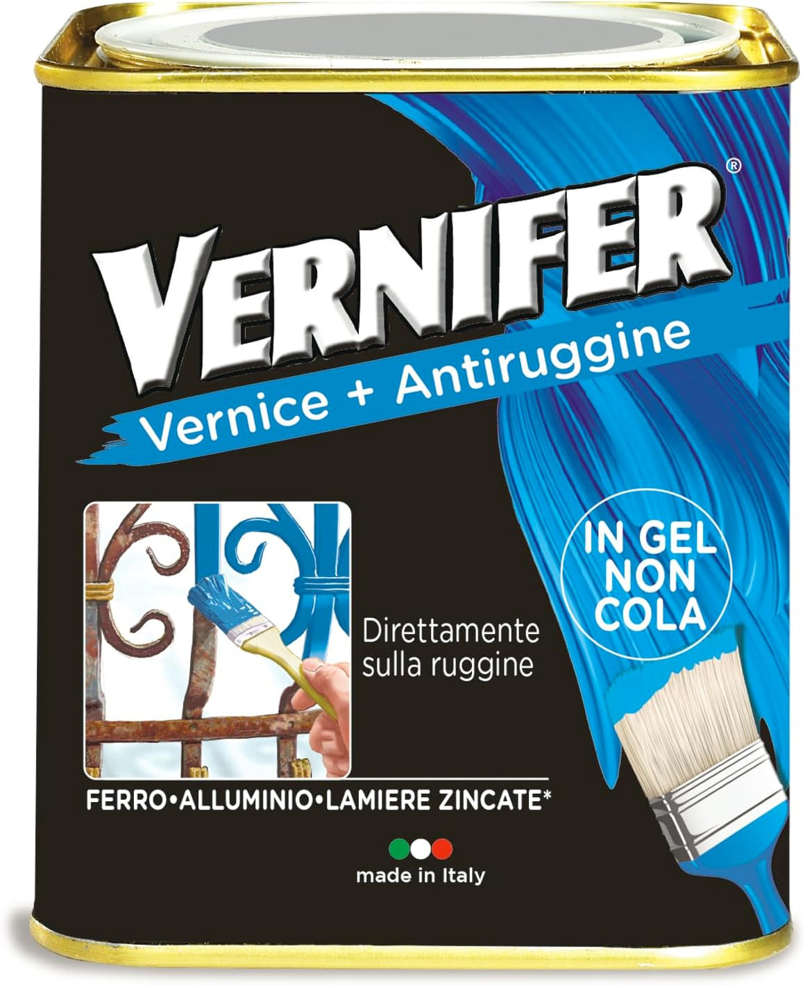 Prodotto verniciante che unisce le proprietà di un ottimo smalto (copertura, lucentezza, gamma colori, protezione dalle intemperie) a quelle tipiche di un fondo antiruggine (protezione e inibizione della corrosione). Strutturato in forma di gel morbido per evitare le colature ed assicurare, al tempo stesso, un’ottima pennellabilità. NB: il potere coprente dipende dalla tinta a dal colore del fondo. Adatto per esterni ed interni. Disponibile nelle tinte brillanti, satinate, metallizzate ed antichizzanti. Prodotto destinato alla protezione e finitura di manufatti in ferro, anche arrugginiti. Non necessita l’applicazione di un fondo anticorrosivo. Idoneo sia per interno che per esterno. Può essere applicato, con buoni risultati, anche su legno, cemento e alluminio. Su lamiera zincata è consigliato applicare una mano di FEROX per evitare che la vernice si sfogli. MODALITÀ D’USO: Per applicazioni a pennello il prodotto è pronto all’uso. In presenza di separazione di liquido superficiale dovrà essere mescolato sino a omogeneizzarlo di nuovo. Per applicazione a rullo diluire con ca. 5% di ragia. Per applicazioni con pistola a spruzzo diluire con ca. 5–15% di ragia. Preparazione del supporto: Superfici nuove: sgrassare la superficie con acquaragia e applicare Vernifer. Superfici già verniciate: spazzolare la vernice scrostata e la ruggine friabile, sgrassare e procedere con Vernifer. La pulizia con diluente nitro è sconsigliata a causa dell’incompatibilità con Vernifer. Consigli: per applicazioni in interno è sufficiente una mano di vernice. Per applicazioni in esterno sono consigliate due mani. Elevata umidità ambientale e spessori eccessivi ritardano l’indurimento del film applicato.