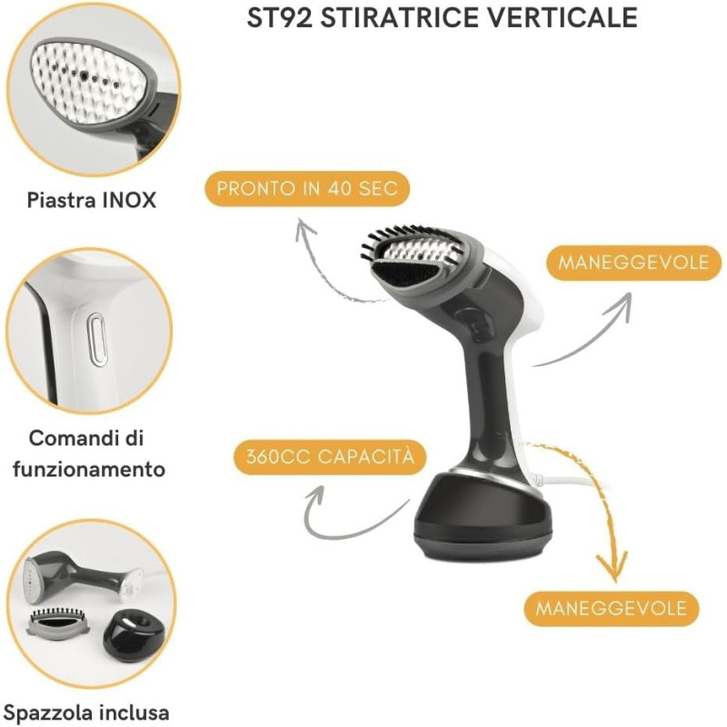 Pensato per la massima praticità, lo ST92 è compatto e leggero, con un peso di soli 985 g, il che lo rende facile da maneggiare e perfetto anche per i viaggi. Il design bilanciato del corpo assicura una presa ergonomica, riducendo l’affaticamento anche durante sessioni di stiratura prolungate. Le sue dimensioni ridotte permettono di riporlo facilmente in valigia o in spazi ristretti, diventando un valido alleato per chi è spesso in movimento.