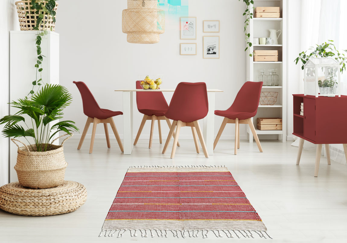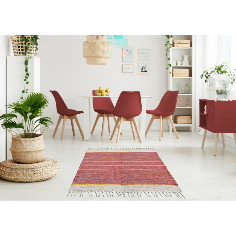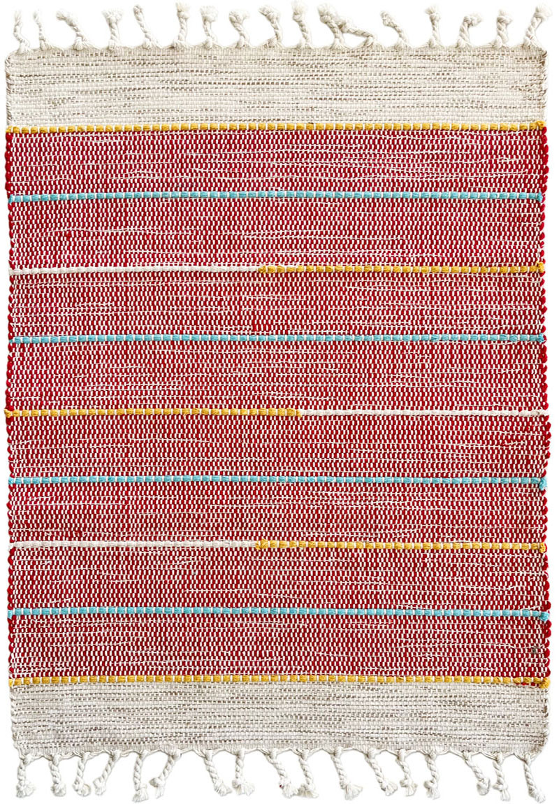 Tappeto in cotone naturale colorato con inserti in filo a contrasto. Adatto al soggiorno, camera da letto, ingresso è dotato di un pratico trattamento antiscivolo ed è lavibile in lavatrice.