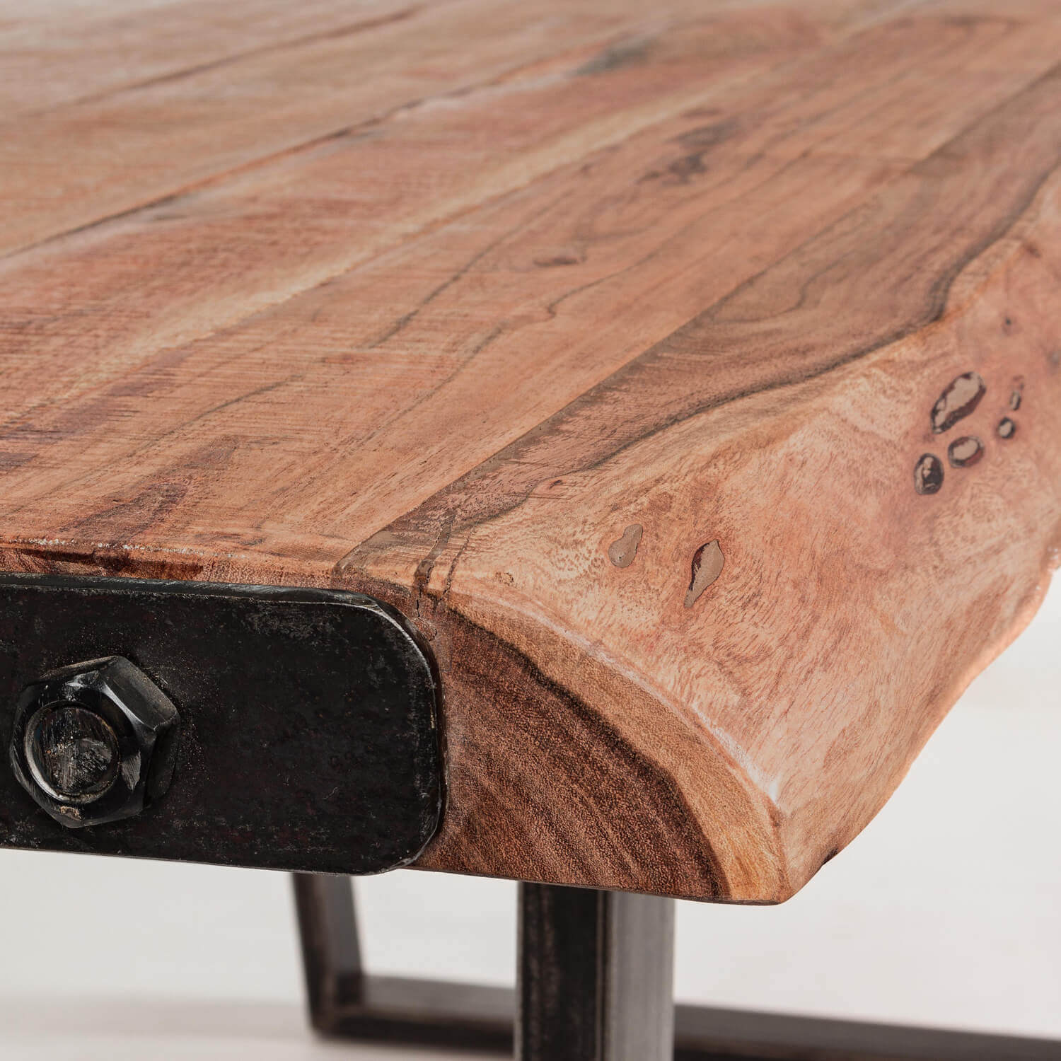 Tavolo da interno modello Elmer realizzato con gambe in acciaio verniciato a polvere epossidica, piano in legno di acacia con sezioni originali di tronco. Finitura acrilica protettiva. Essendo un piano lavorato a mano, le forme e le misure del legno sono solo indicative. Tutti i prodotti saranno diversi l'uno dall'altro. Gambe da assemblare. Dimensioni in cm: Lunghezza 180 - Profondità 90 - Altezza 77