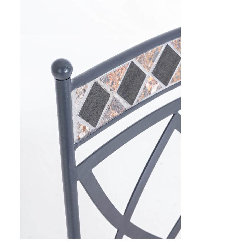 Lo schienale della poltrona è impreziosito da un decoro in ceramica con lavorazione a mosaico, che aggiunge un tocco artistico e raffinato al design complessivo.