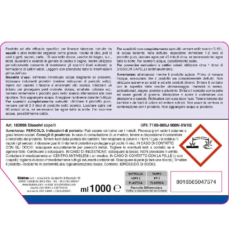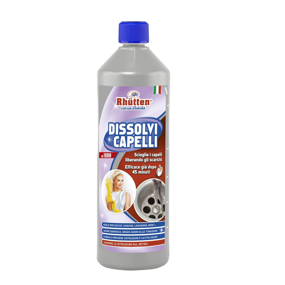Prodotto ad alta efficacia specifico per liberare tubazioni ostruite da capelli e altro materiale organico come grasso, residui di cibo, peli di cani e gatti, saponi, carta